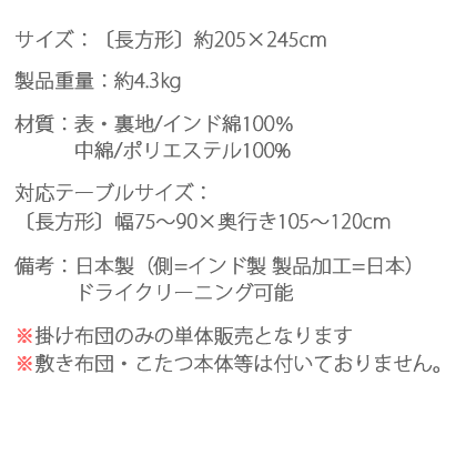 サイズ:〔長方形〕約205×245cm 製品重量:約4.3kg 材質:表・裏地/インド綿100%、中綿/ポリエステル100% 対応テーブルサイズ:〔長方形〕幅75〜90×奥行き105〜120cm 備考:日本製(側=インド製 製品加工=日本)、ドライクリーニング可能、※掛け布団のみの単体販売となります、※敷き布団・こたつ本体等は付いておりません。